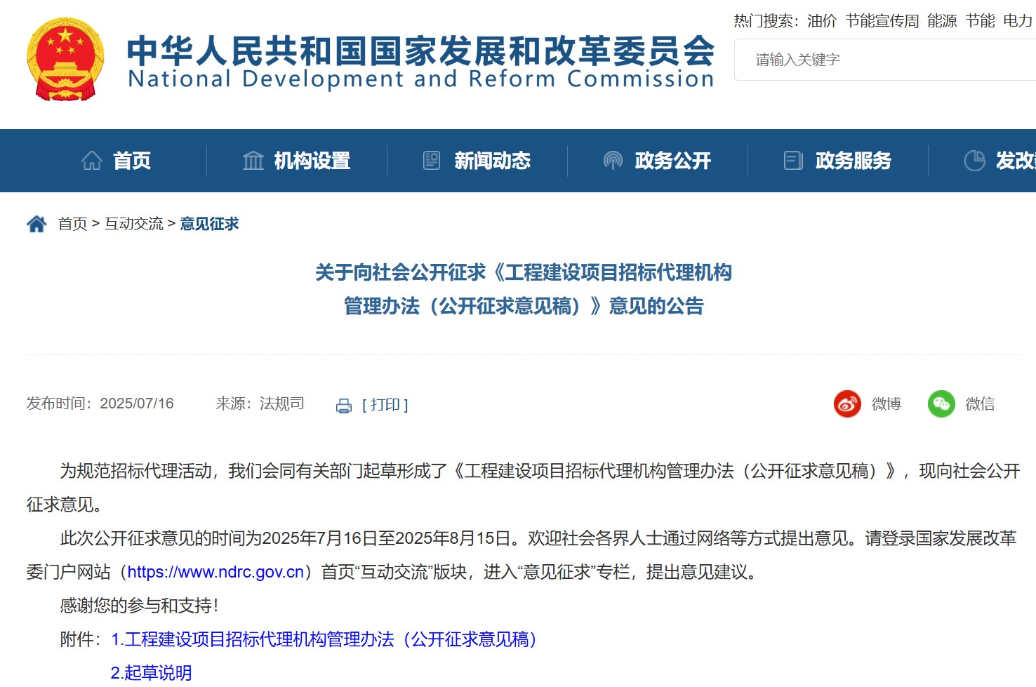 為規(guī)范招標(biāo)代理活動(dòng),國(guó)家發(fā)展和改革委員會(huì)會(huì)同有關(guān)部門(mén)起草形成了《工程建設(shè)項(xiàng)目招標(biāo)代理機(jī)構(gòu)管理辦法(公開(kāi)征求意見(jiàn)稿)》,現(xiàn)向社會(huì)公開(kāi)征求意見(jiàn)。此次公開(kāi)征求意見(jiàn)的時(shí)間為2025年7月16日至2025年8月15日。